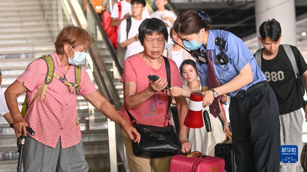 在南寧東站,客運員唐瑩在幫助老人乘車(chē)(7月11日攝)。