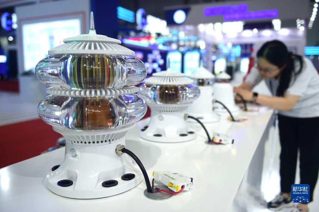 7月12日,在航??萍疾┯[會(huì )上拍攝的支持北斗遠程數據的智能化航標燈。