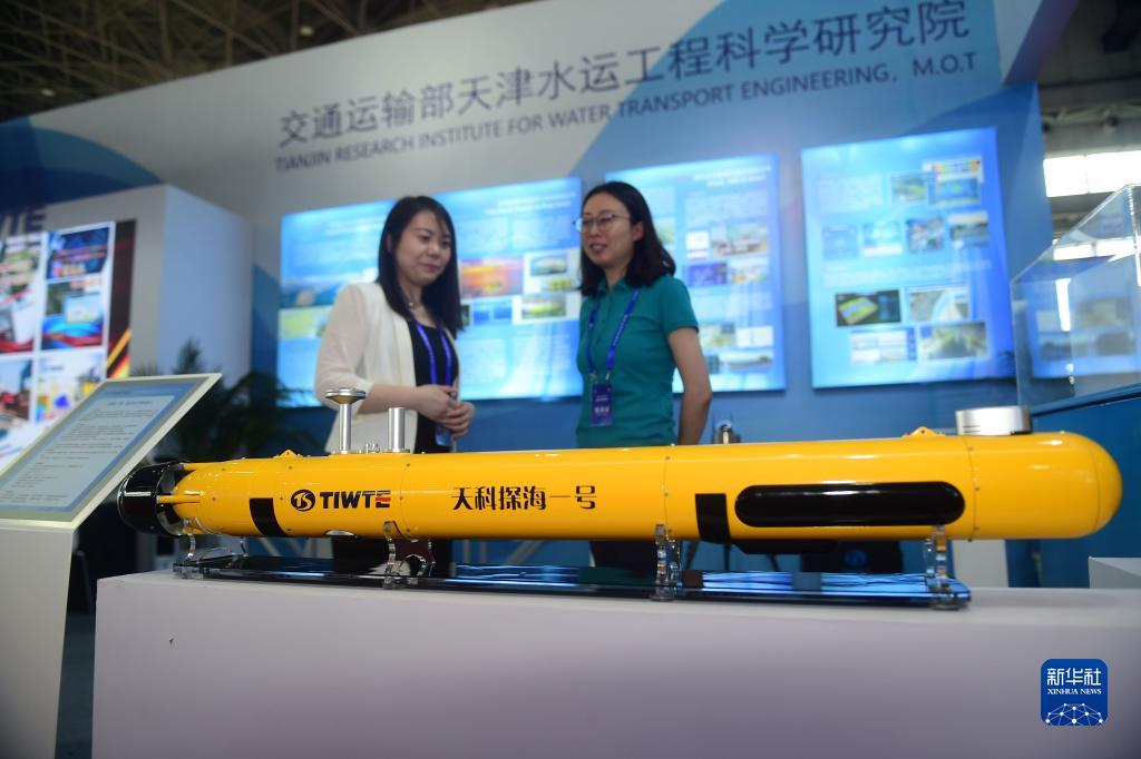 7月12日,在航??萍疾┯[會(huì )上拍攝的“探海一號”自主水下機器人。