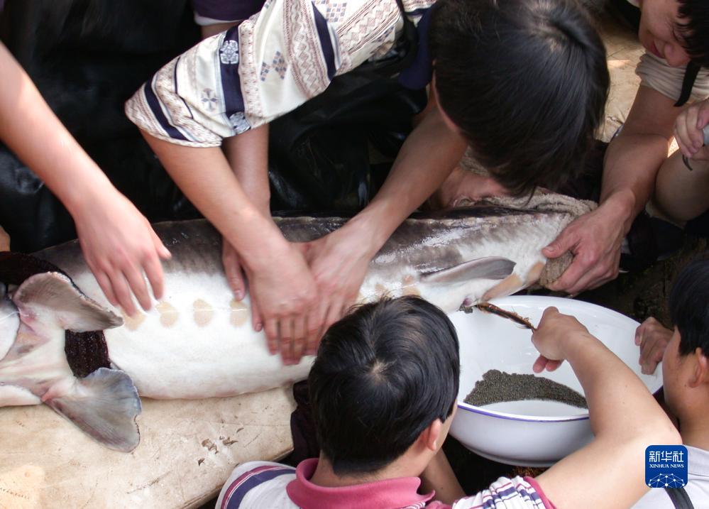 周亮(下左)在進(jìn)行長(cháng)江鱘人工擠卵(資料照片)。新華社發(fā)
