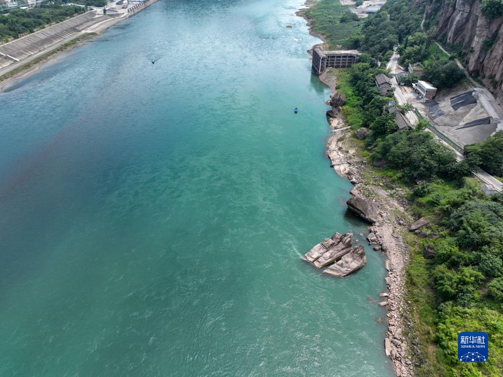 這是2023年6月20日拍攝的位于金沙江四川省宜賓段的三塊石(無(wú)人機照片)。這里曾經(jīng)是著(zhù)名的白鱘、中華鱘、長(cháng)江鱘產(chǎn)卵場(chǎng)。新華社發(fā)(莊歌爾 攝)
