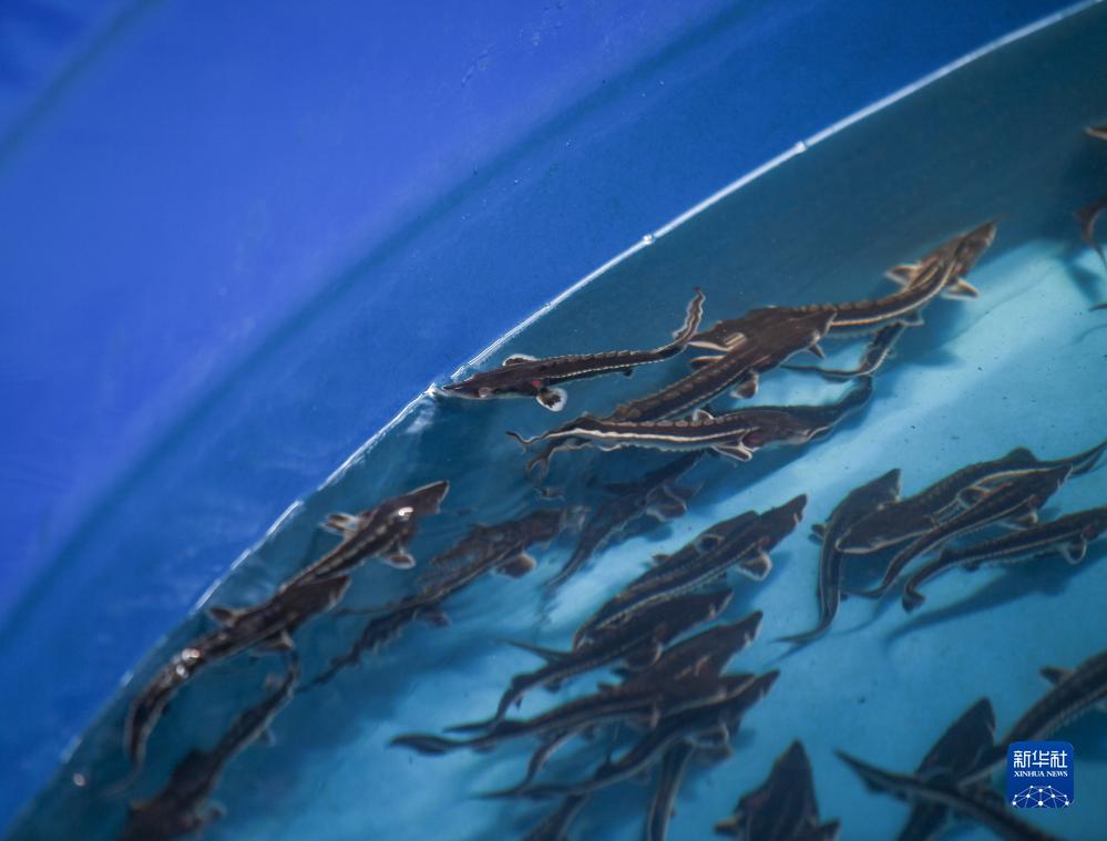 這是2023年6月27日在宜賓珍稀水生動(dòng)物研究所與四川省農科院水產(chǎn)研究所合作的繁育基地拍攝的長(cháng)江鱘幼魚(yú)。新華社記者 王曦 攝