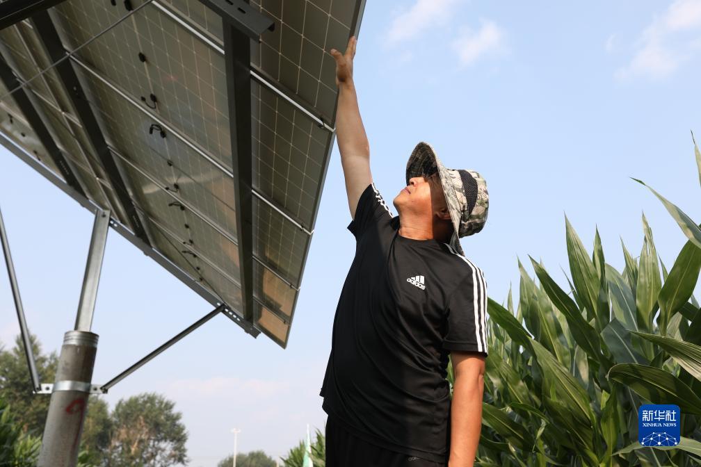 7月11日,在遼寧省彰武縣馮家鎮哈大冷村,馮家鎮政府工作人員在檢查太陽(yáng)能光伏發(fā)電設備。