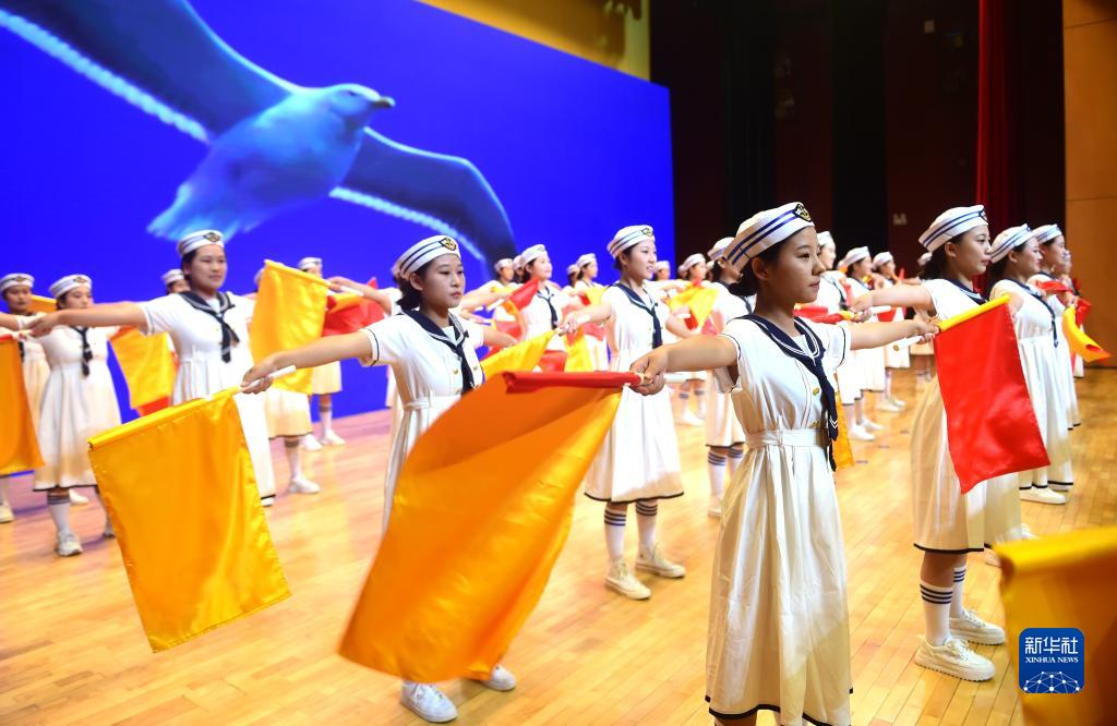 7月12日,在2023年航??破障牧顮I(yíng)開(kāi)營(yíng)儀式上,學(xué)生表演舞蹈《旗語(yǔ)》。