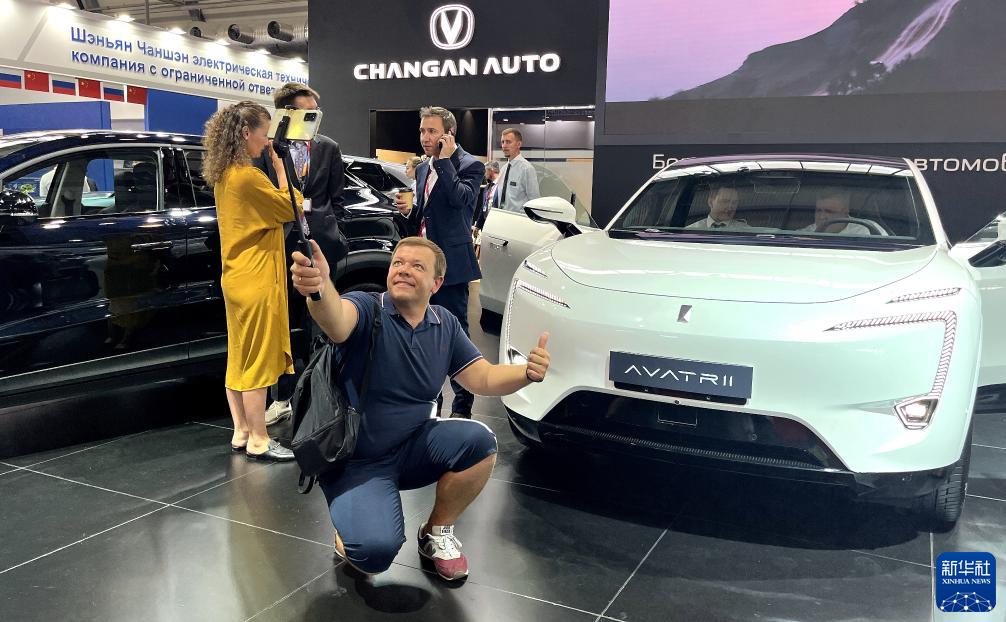 7月11日,在俄羅斯葉卡捷琳堡舉辦的第七屆中俄博覽會(huì )上,參觀(guān)者與中方企業(yè)展出的汽車(chē)合影。