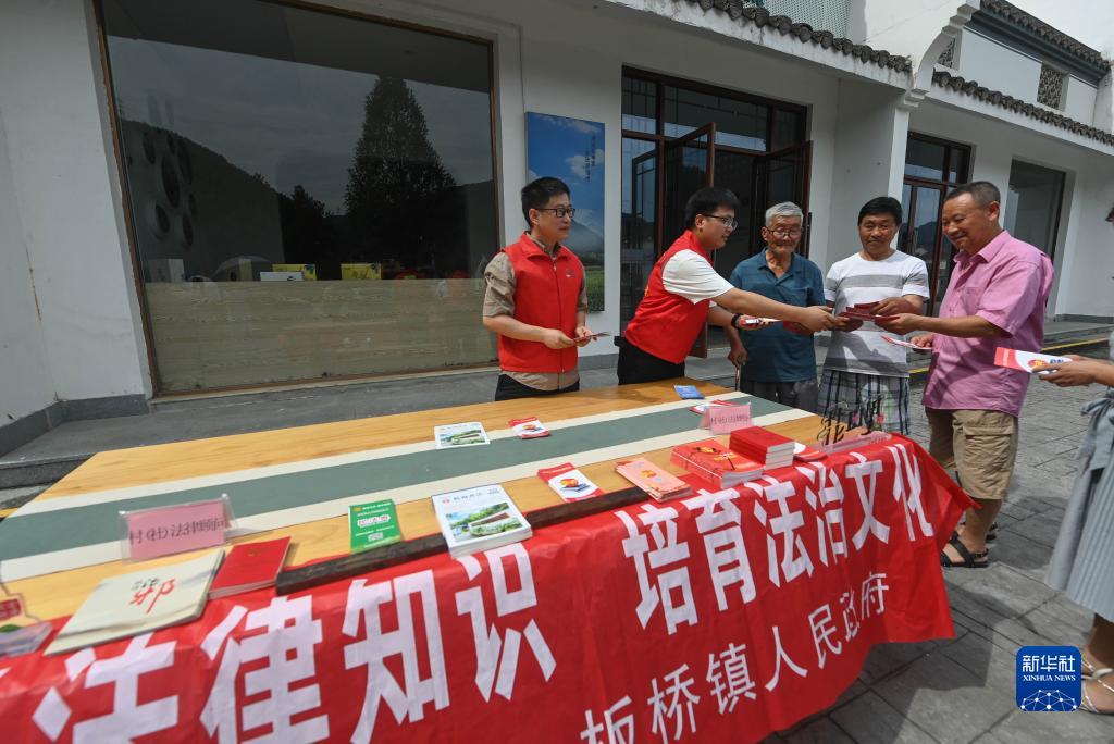 7月13日,在杭州市臨安區板橋鎮上田村文化禮堂前,板橋鎮聯(lián)合共建單位舉行“法律服務(wù)到村口”活動(dòng),黨員志愿者發(fā)放宣傳手冊并解答群眾的法律問(wèn)題。