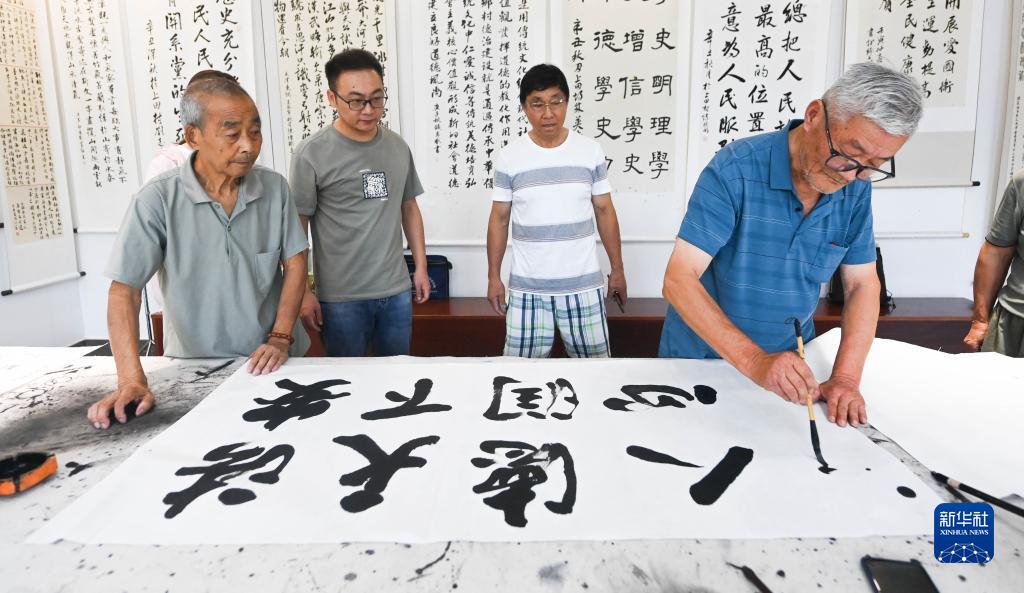 7月13日,在杭州市臨安區板橋鎮上田村文化禮堂,書(shū)法愛(ài)好者書(shū)寫(xiě)用于法治宣傳教育的書(shū)法作品。