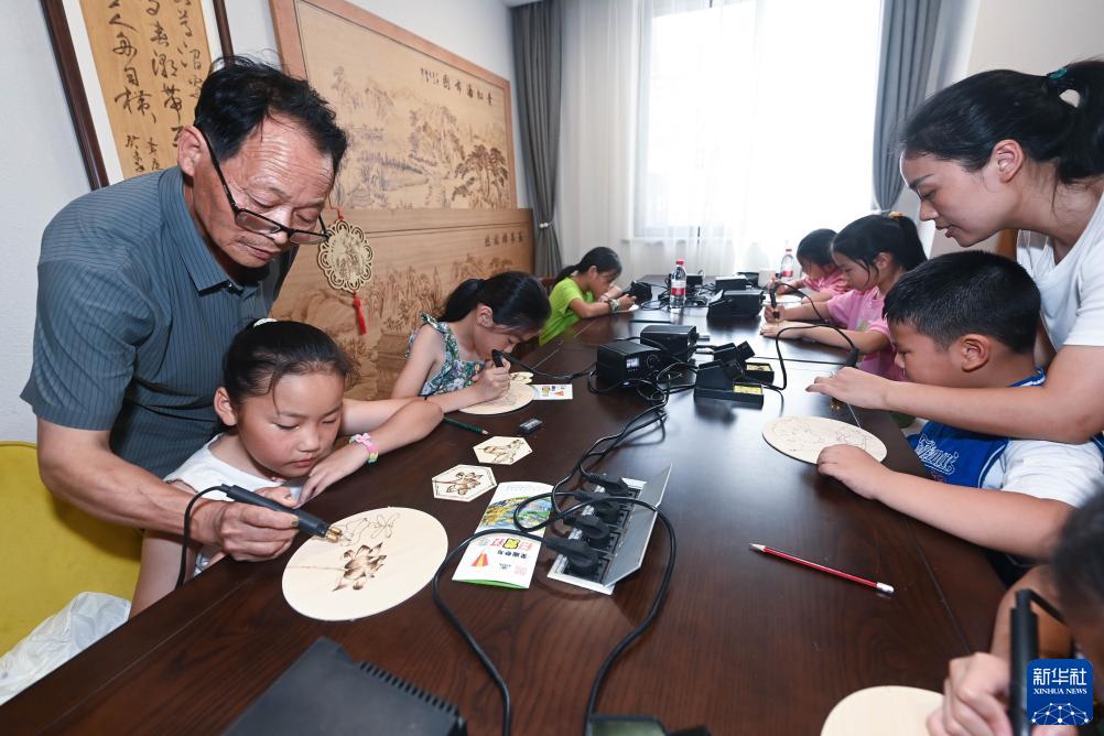 7月13日,在杭州市臨安區湍口鎮黨群服務(wù)中心,新鄉賢、湍口燙畫(huà)技藝代表性傳承人葉福來(lái)(左一)在指導孩子們學(xué)習燙畫(huà)。