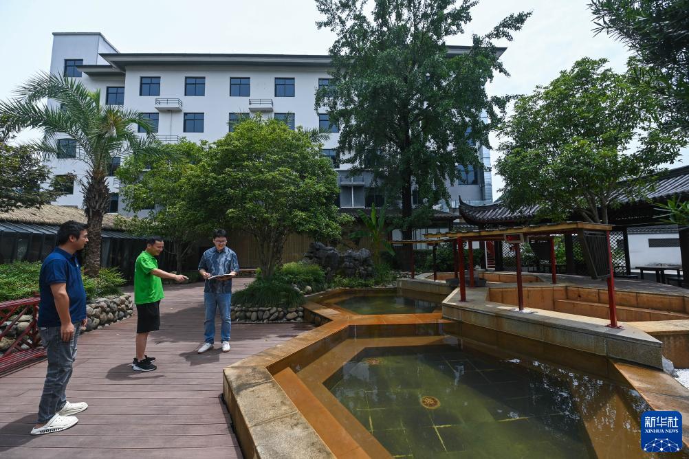 7月13日,在杭州湍口蘆荻古溫泉度假酒店,酒店負責人何資穎(右一)在和員工一起討論溫泉升級提升方案。2019年,通過(guò)湍口鎮“兩進(jìn)兩回”行動(dòng)牽引和新鄉賢牽線(xiàn)搭橋,何資穎來(lái)到湍口鎮經(jīng)營(yíng)溫泉酒店,為周邊村民提供80余個(gè)就業(yè)崗位。