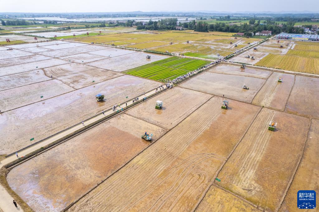 7月13日,在巖汪湖鎮武竺山村,農民駕駛插秧機進(jìn)行水稻插秧比拼(無(wú)人機照片)。