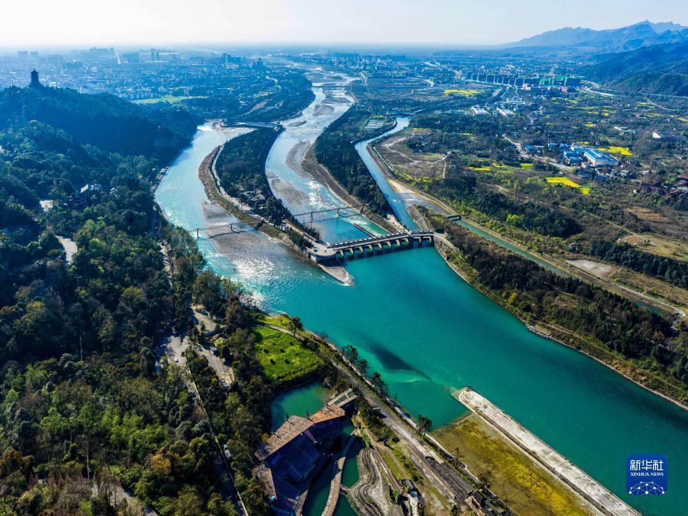 俯瞰都江堰水利工程,錦江起于都江堰(2023年3月4日攝)。新華社發(fā)(王琦攝)