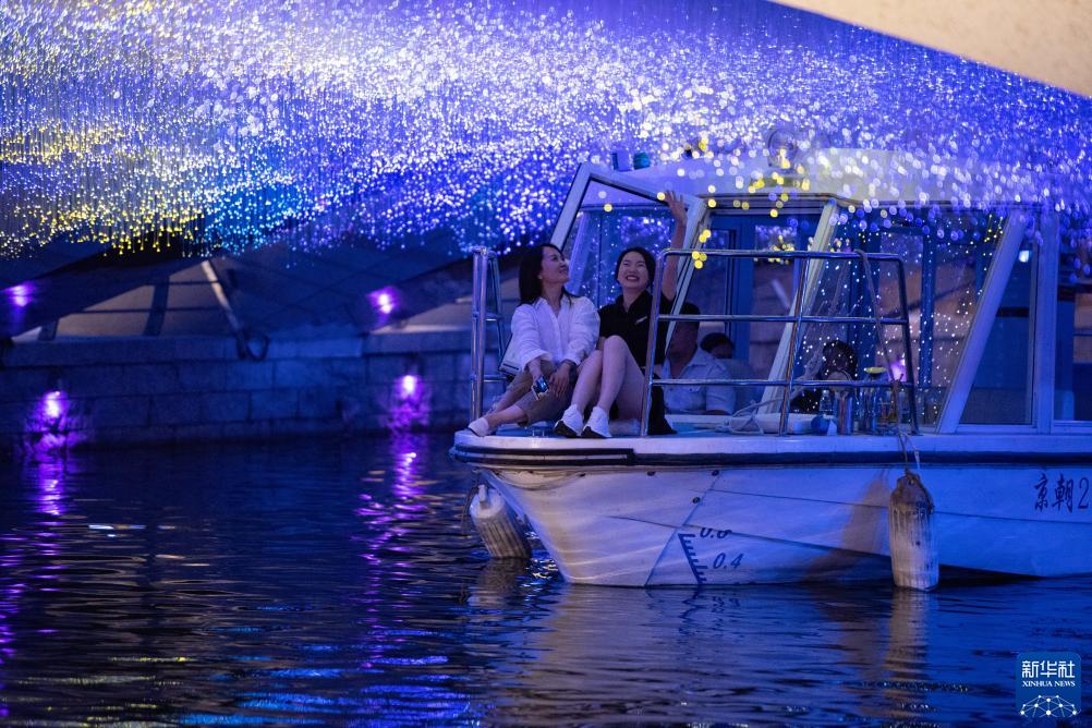 這是人們乘坐北京亮馬河游船經(jīng)過(guò)被裝點(diǎn)成“星空”的好運橋(6月16日攝)。