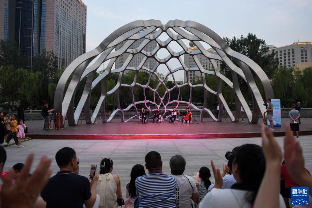 這是人們在北京亮馬河畔觀(guān)看“亮馬河藝術(shù)之夜”演出(6月23日攝)。