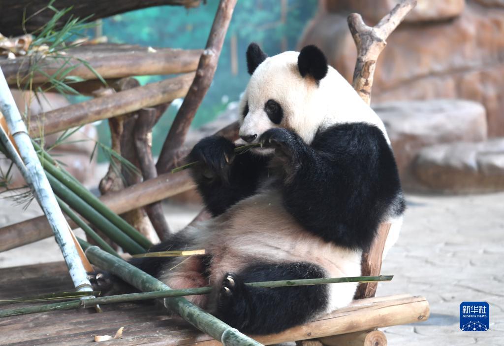 7月13日,一只大熊貓在廣西南寧市動(dòng)物園空調房里享受美食。