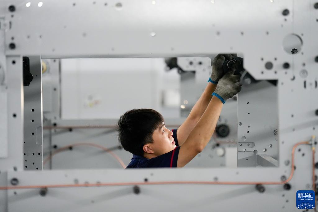 7月13日,河北省玉田縣一家印刷包裝機械制造企業(yè)的工人在安裝產(chǎn)品零部件。