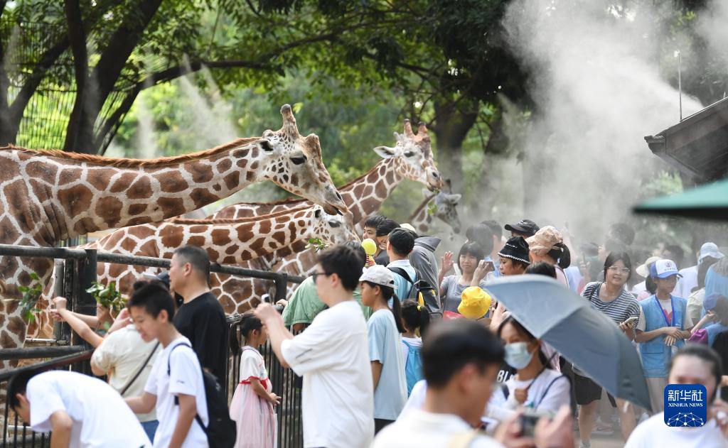 7月13日,廣州動(dòng)物園采用降溫噴霧給長(cháng)頸鹿避暑。