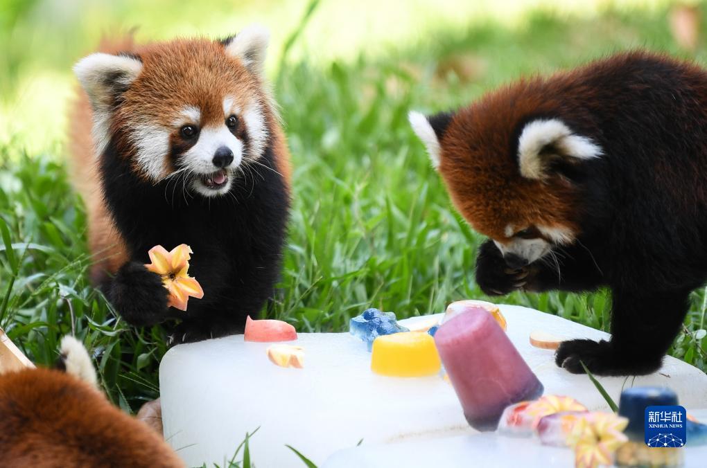 7月13日,廣州動(dòng)物園里的小熊貓享用冰鎮水果。