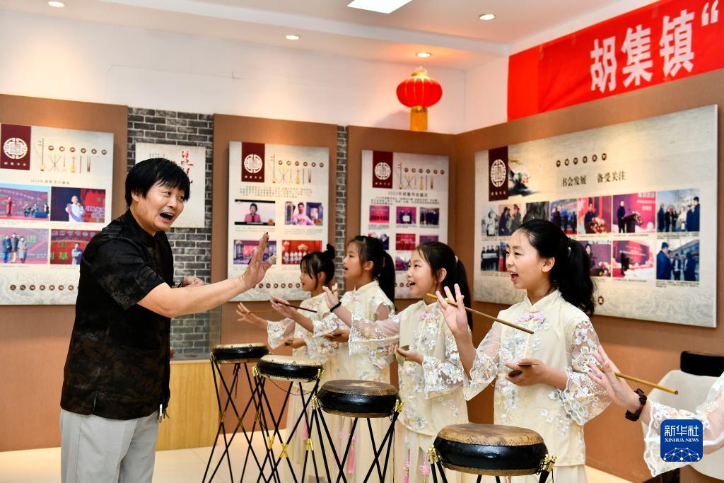 7月13日,在惠民縣胡集鎮一處“濱濱學(xué)堂”,公益講師馮增奎教孩子們西河大鼓。