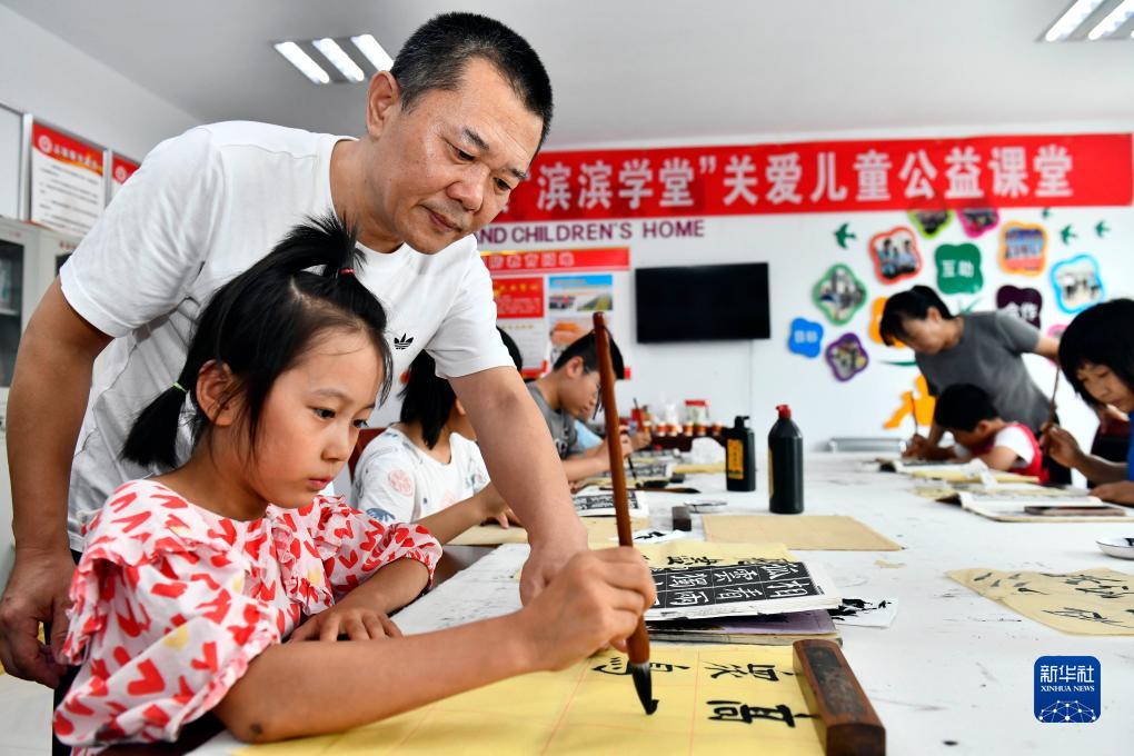 7月13日,在惠民縣胡集鎮一處“濱濱學(xué)堂”,公益講師常春輝教孩子們練習書(shū)法。