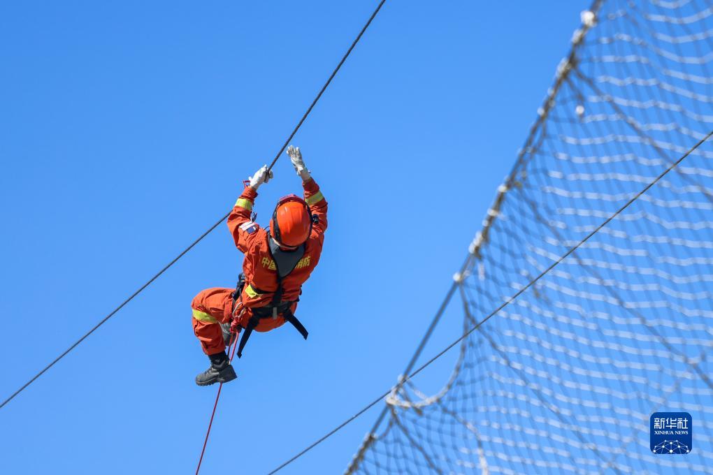 7月13日,一名消防員在專(zhuān)業(yè)技能大比武中模擬山岳救援。