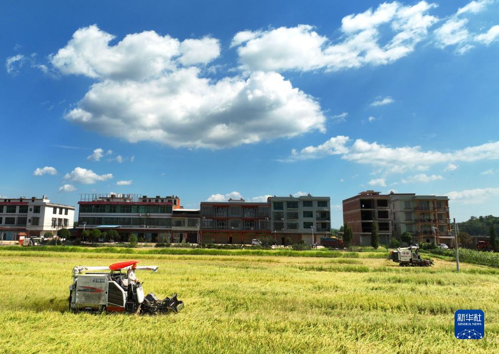 7月12日,在衡陽(yáng)市祁東縣金橋鎮,農機手駕駛收割機在收割早稻(無(wú)人機照片)。