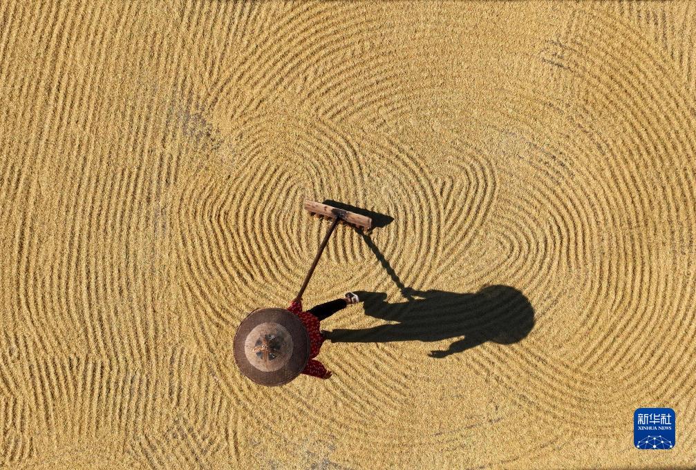 7月12日,在衡陽(yáng)市祁東縣金橋鎮,當地村民在晾曬早稻(無(wú)人機照片)。