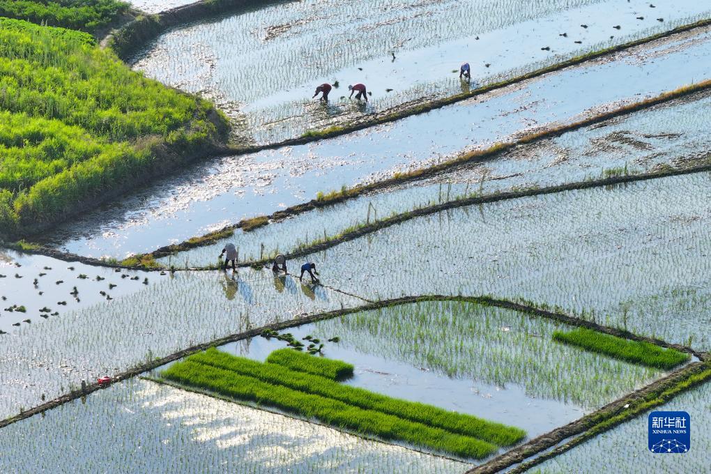 7月11日,在衡陽(yáng)市衡東縣吳集鎮楊梓坪村,村民在插晚稻(無(wú)人機照片)。