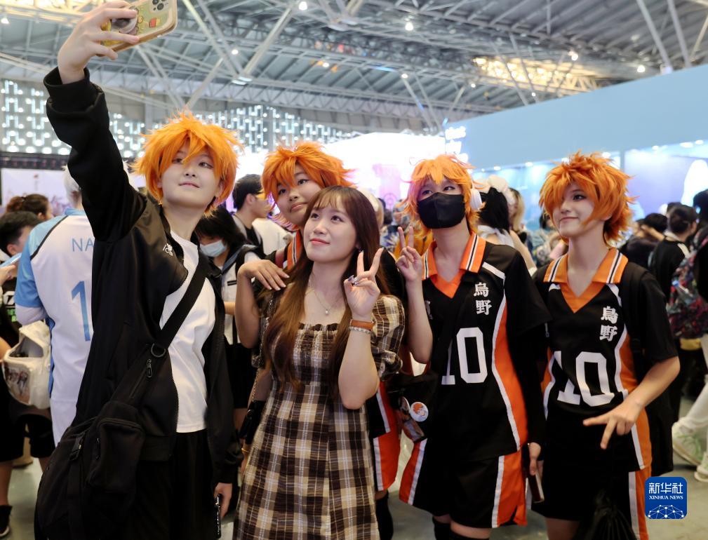 7月13日,參觀(guān)者和動(dòng)漫造型的角色扮演者合影。