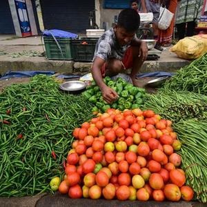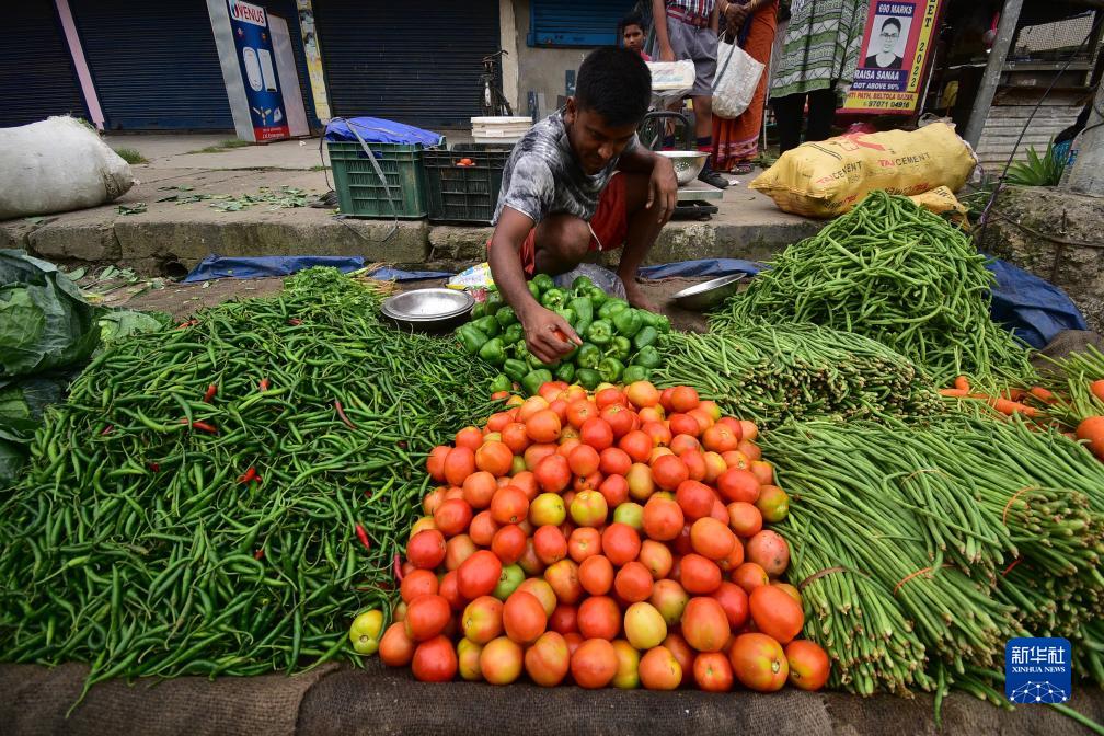 7月13日,印度阿薩姆邦首府高哈蒂的商販在街頭販賣(mài)西紅柿及其他蔬菜。