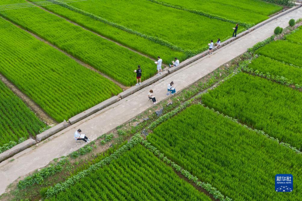 山西工學(xué)院的學(xué)生們在左權縣東安村寫(xiě)生(7月13日攝,無(wú)人機照片)。