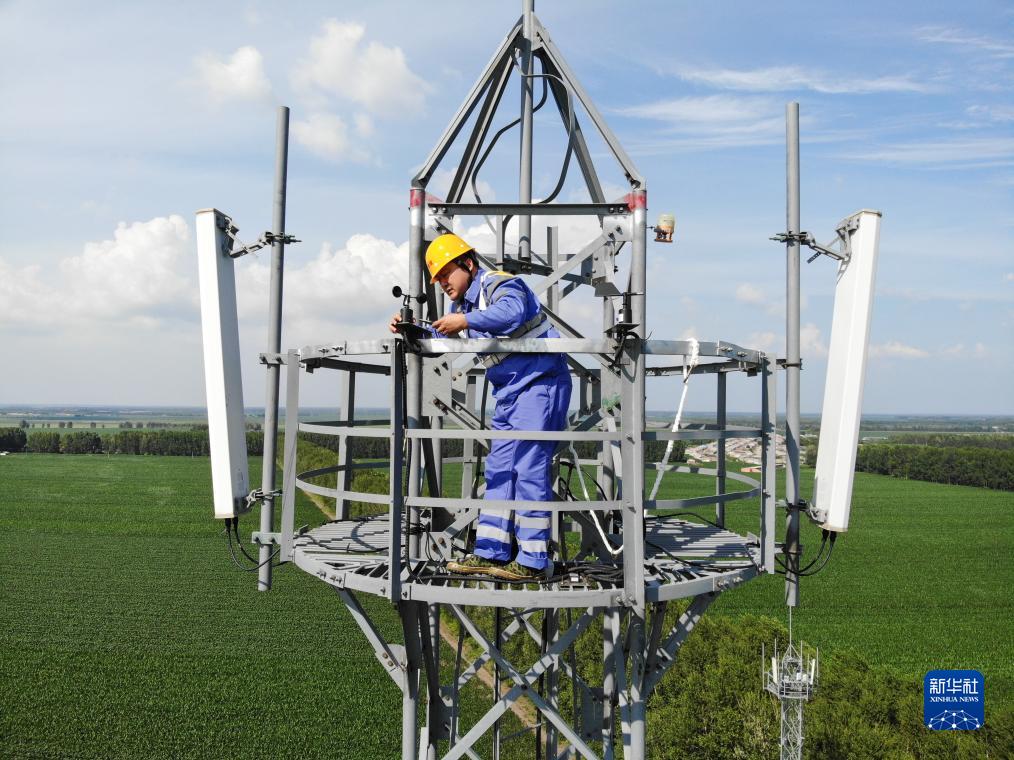 7月13日,位于肇東市的哈齊高鐵12號基站鐵路通信鐵塔上,魏巍進(jìn)行維護鐵路通信設備作業(yè)(無(wú)人機照片)。