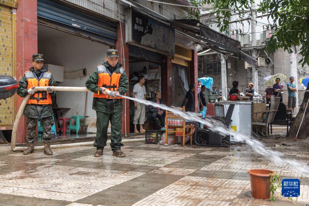 7月14日,在重慶市萬(wàn)州區五橋街道五間橋社區,武警重慶總隊船艇支隊官兵在洪水退去后沖洗地面。