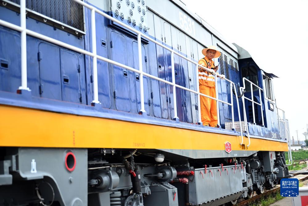 7月13日,合肥火車(chē)站運轉車(chē)間調車(chē)長(cháng)崔中虎在指揮調車(chē)作業(yè)。