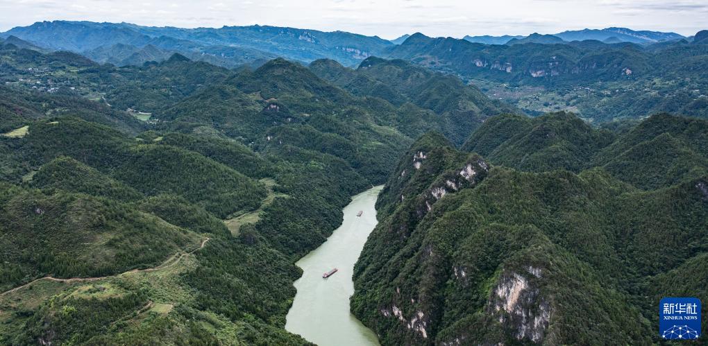 集裝箱貨輪從貴州省遵義市余慶縣沙灣碼頭駛出,前往重慶涪陵黃旗港(7月14日攝,無(wú)人機照片)。