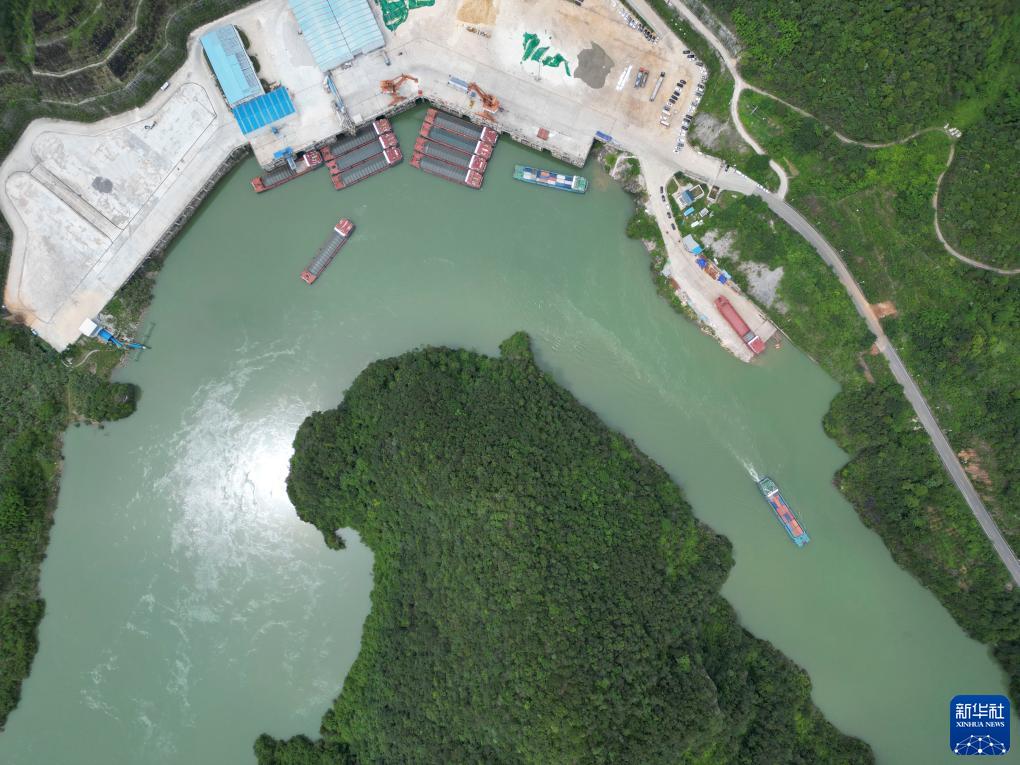 集裝箱貨輪從貴州省遵義市余慶縣沙灣碼頭陸續駛出(7月14日攝,無(wú)人機照片)。