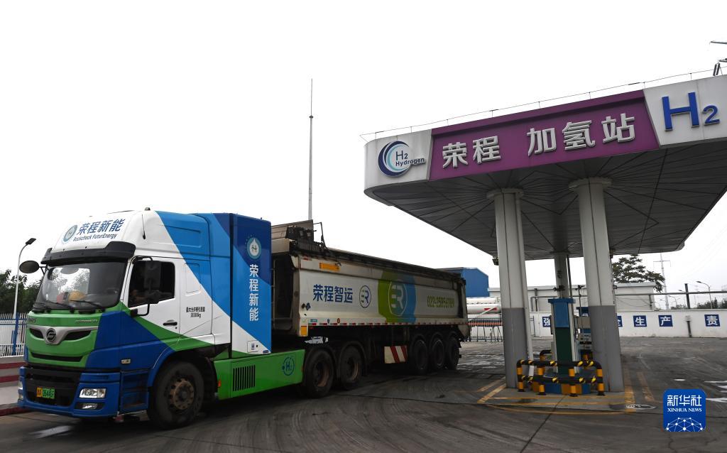 一輛氫能重卡從天津榮程聯(lián)合鋼鐵集團有限公司加氫站駛出(7月13日攝)。