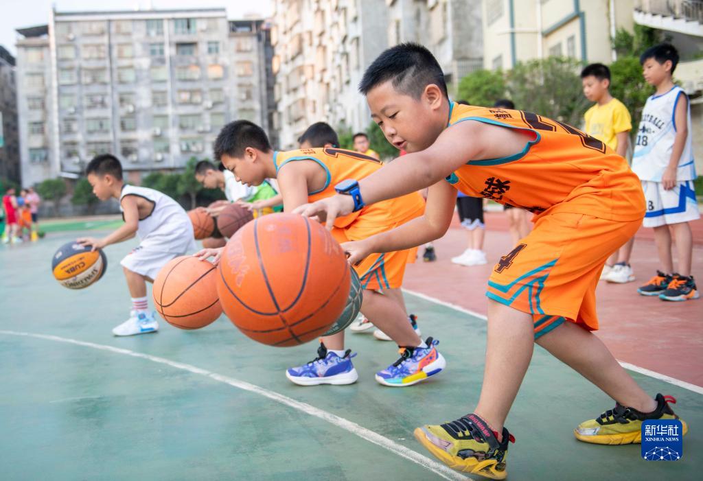 7月14日,在湖南省永州市道縣樹(shù)湘學(xué)校運動(dòng)場(chǎng),孩子們參加籃球訓練。