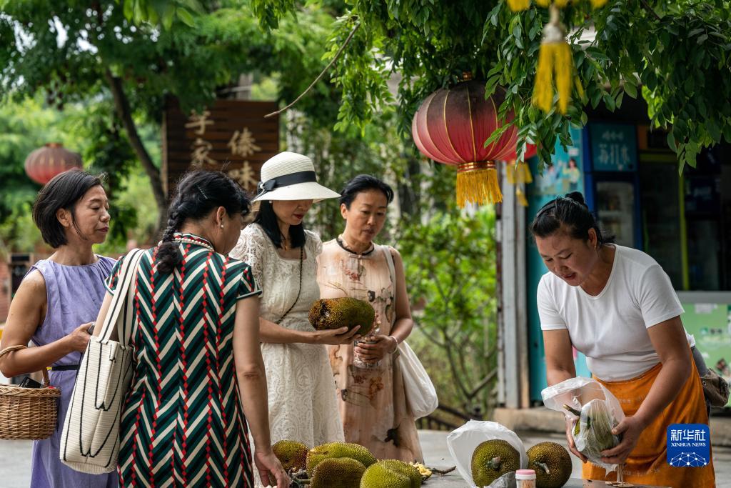 7月14日,游客在云南省德宏傣族景頗族自治州芒市風(fēng)平鎮帕底村介桃村民小組購買(mǎi)菠蘿蜜。