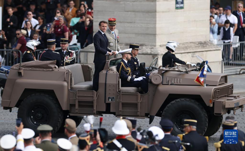7月14日,法國總統馬克龍抵達巴黎協(xié)和廣場(chǎng)的國慶閱兵式現場(chǎng)。新華社記者 高靜 攝