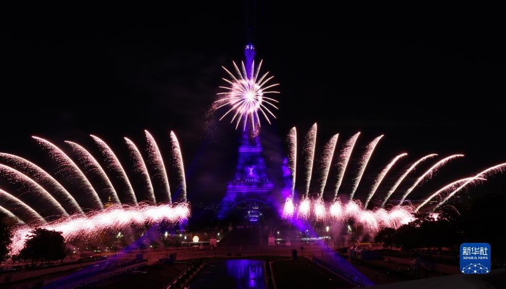 7月14日,焰火在法國巴黎埃菲爾鐵塔周?chē)`放。