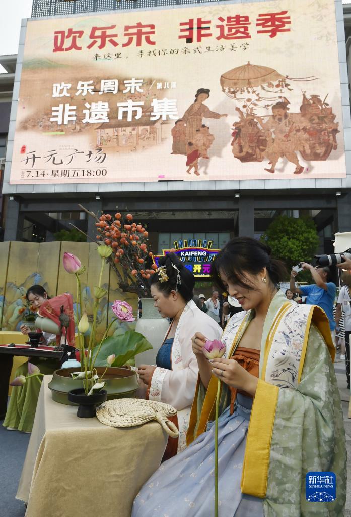 7月14日傍晚,工作人員在開(kāi)封市開(kāi)元廣場(chǎng)設立的“非遺市集”現場(chǎng)展示插花技藝。