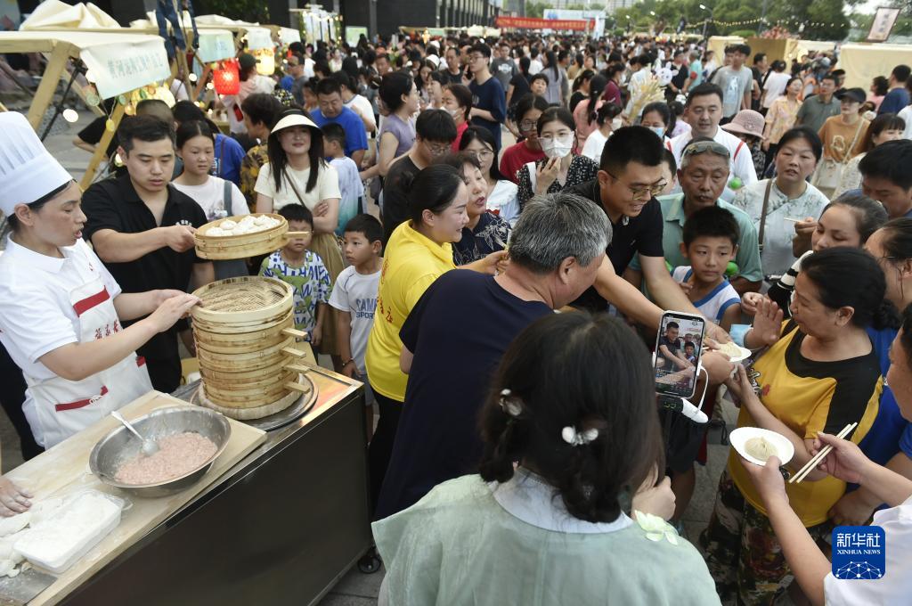 7月14日傍晚,游人在開(kāi)封市開(kāi)元廣場(chǎng)設立的“非遺市集”現場(chǎng)品嘗開(kāi)封灌湯包。