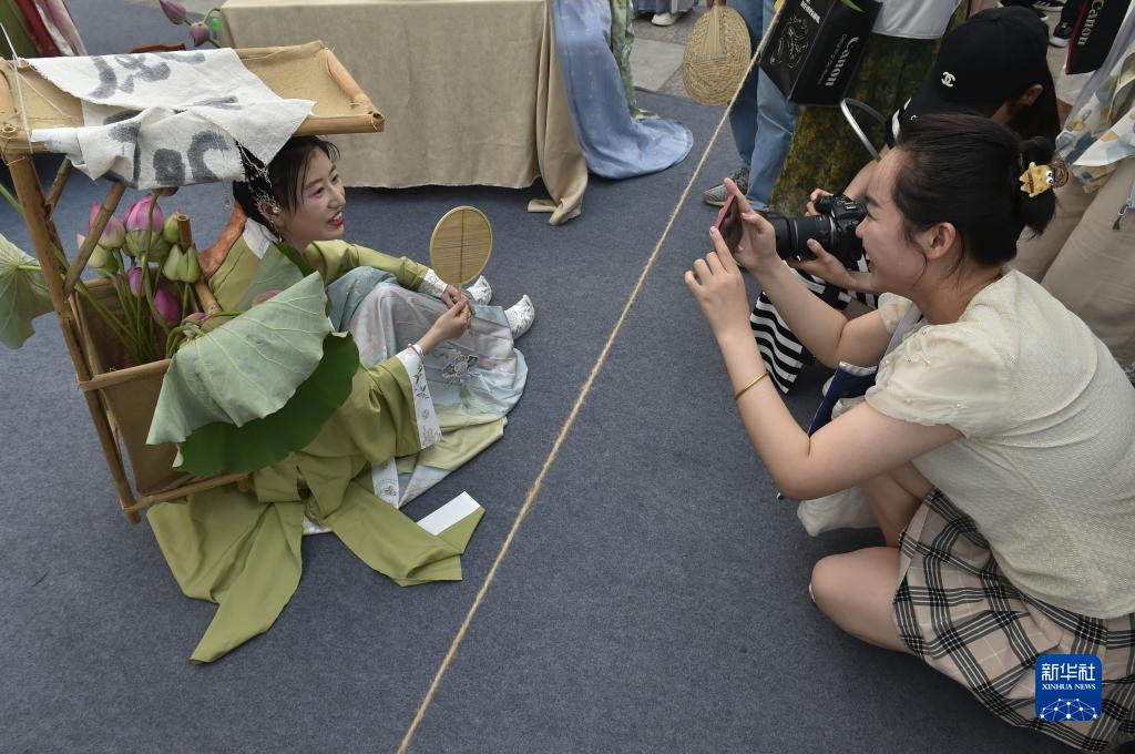 7月14日傍晚,身穿古裝的游人(左)在開(kāi)封市開(kāi)元廣場(chǎng)設立的“非遺市集”現場(chǎng)留影。