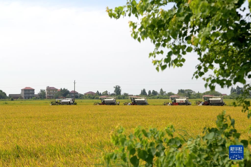在江西南昌縣塘南鎮北聯(lián)村,多臺聯(lián)合收割機在田間穿梭,搶收稻谷(7月13日攝)。