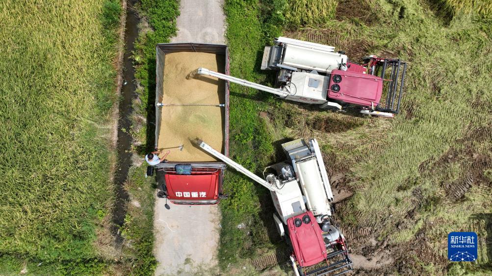 在江西省南昌縣塘南鎮北聯(lián)村,收割機將稻谷轉運至裝谷車(chē)內(7月13日攝,無(wú)人機照片)。