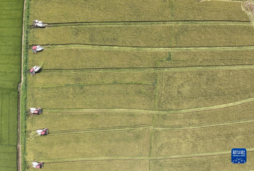 在江西省南昌縣塘南鎮北聯(lián)村,多臺聯(lián)合收割機在田間穿梭,搶收稻谷(7月13日攝,無(wú)人機照片)。