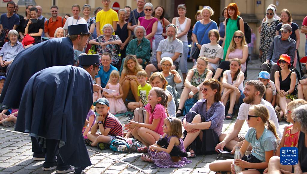 7月14日,藝術(shù)工作者在捷克首都布拉格街頭戲劇節上與觀(guān)眾互動(dòng)。