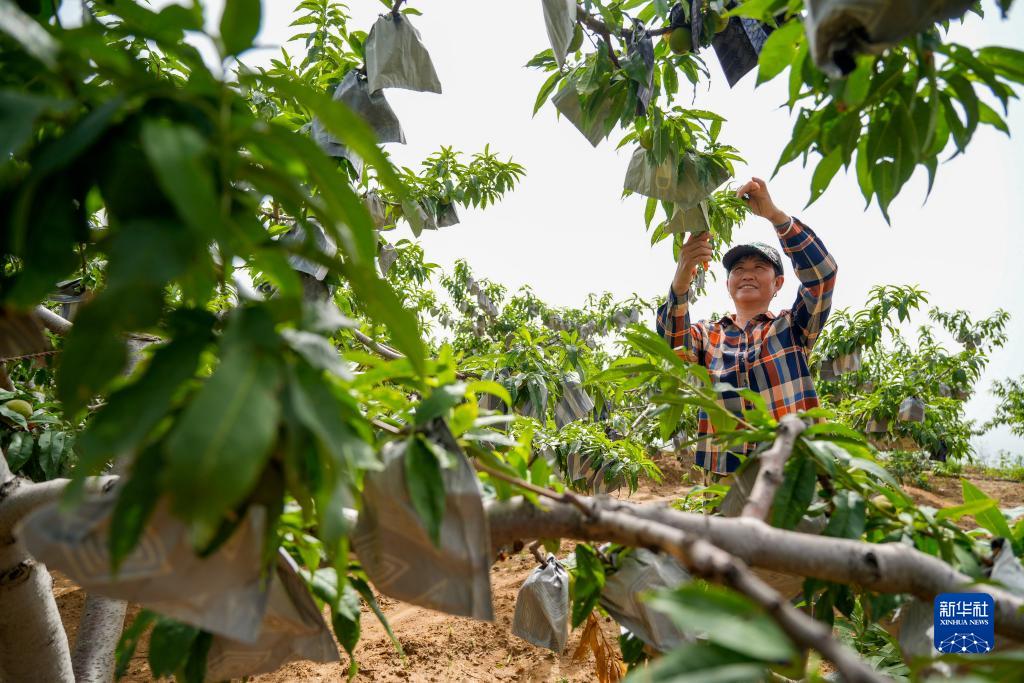 7月14日,工人在河北省唐山市古冶區一處修復礦山后建成的果園內打理果樹(shù)。