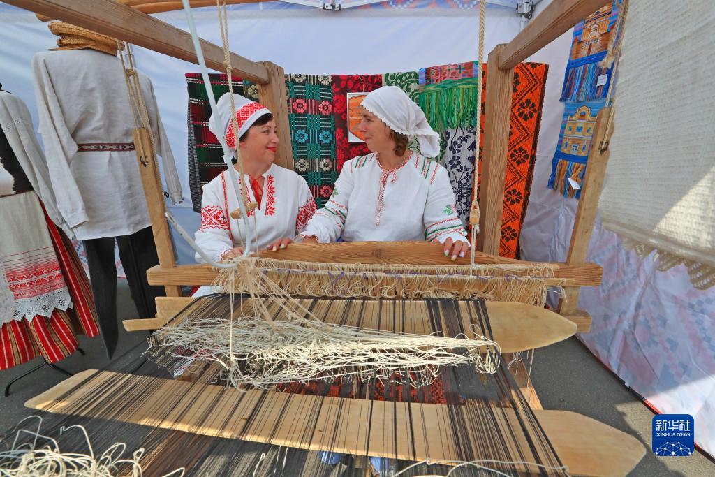 7月14日,參展人員在白俄羅斯維捷布斯克“斯拉夫巴扎”國際藝術(shù)節上演示傳統織布。