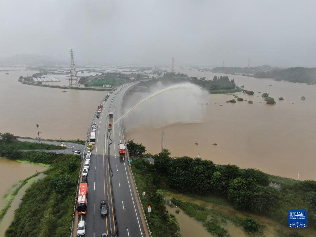 7月15日,在韓國忠清北道清州市,消防工作人員進(jìn)行抽水作業(yè)。